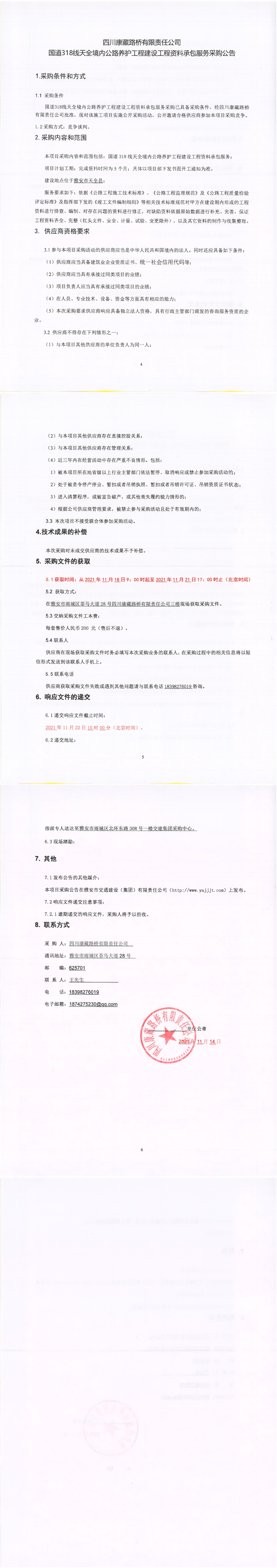 四川康藏路橋有限責任公司國道318線天全境內(nèi)公路養(yǎng)護工程建設(shè)工程資料承包服務(wù)采購公告