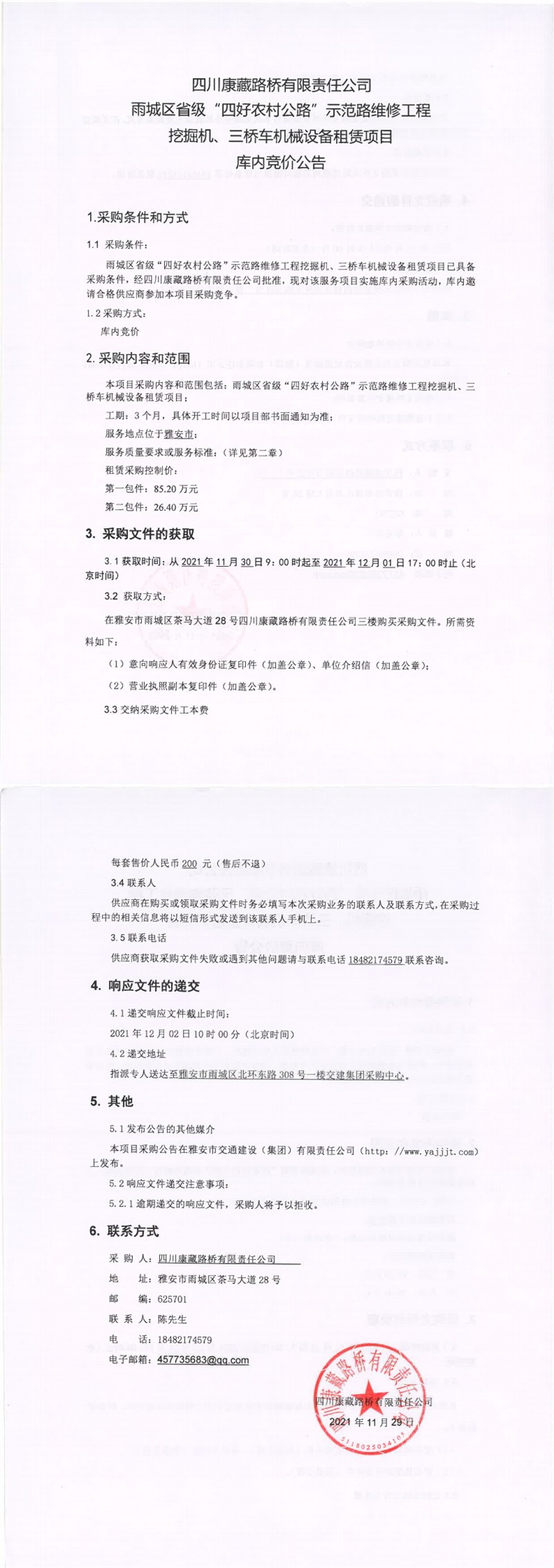 四川康藏路橋有限責(zé)任公司雨城區(qū)省級“四好農(nóng)村公路”示范路維修工程挖掘機(jī)、三橋車機(jī)械設(shè)備租賃項(xiàng)目庫內(nèi)競價(jià)公告