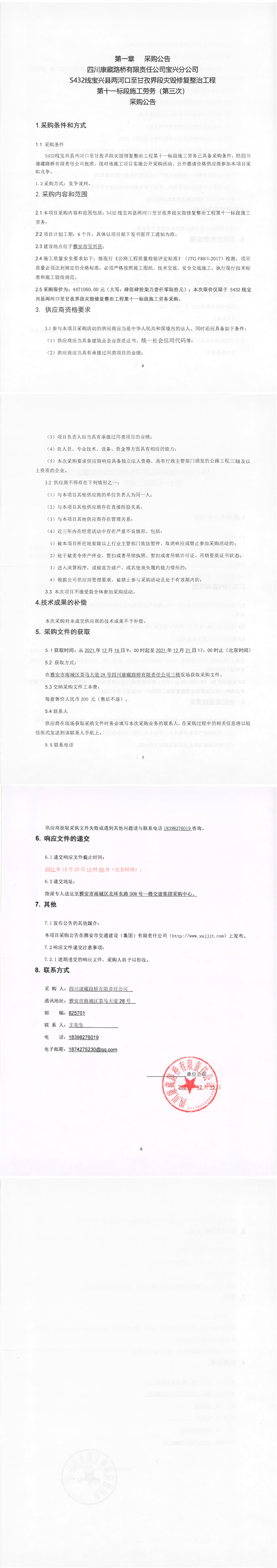 四川康藏路橋有限責任公司寶興分公司S432線寶興縣兩河口至甘孜界段災(zāi)毀修復整治工程第十一標段施工勞務(wù)(第三次)采購公告