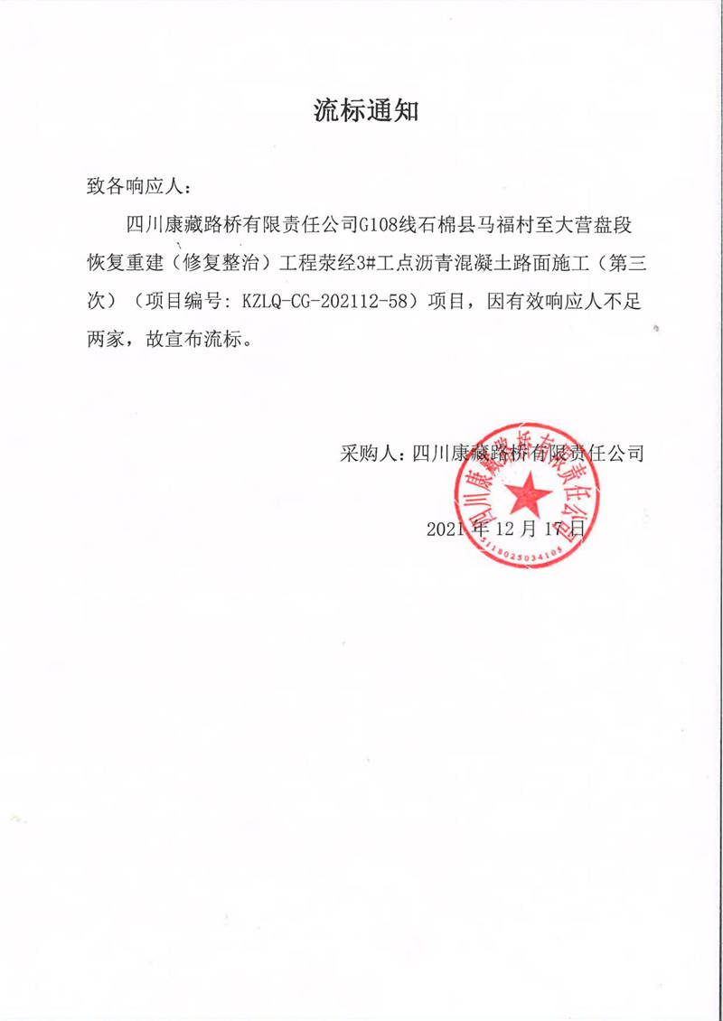 四川康藏路橋有限責任公司G108線石棉縣馬福村至大營盤段恢復重建(修復整治)工程滎經(jīng)3#工點瀝青混凝土路面施工(第三次)流標通知