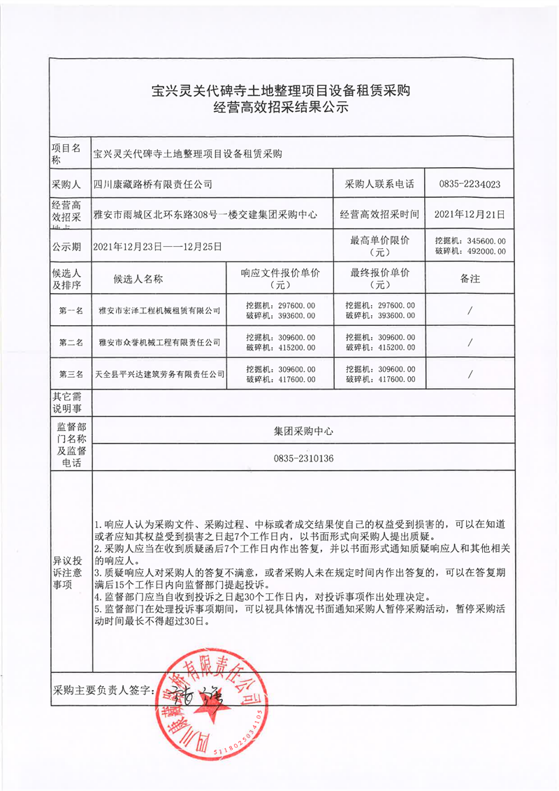 四川康藏路橋有限責任公司寶興靈關(guān)代碑寺土地整理項目設(shè)備租賃采購經(jīng)營高效招采結(jié)果公示