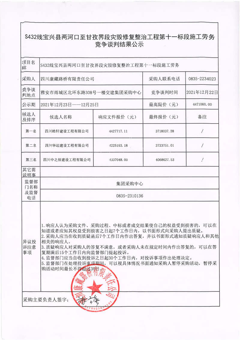四川康藏路橋有限責任公司S432線寶興縣兩河口至甘孜界段災毀修復整治工程第十一標段施工勞務競爭談判結(jié)果公示