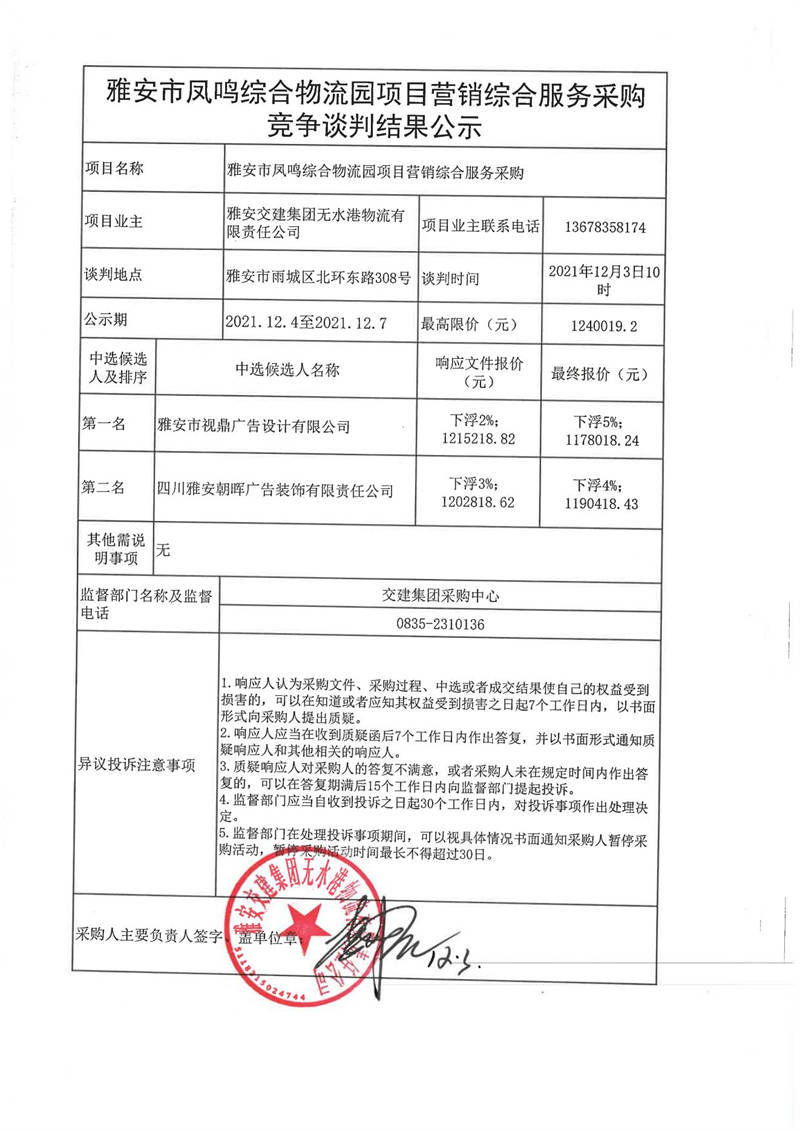 雅安交建集團無水港物流有限責(zé)任公司雅安市鳳鳴綜合物流園項目營銷綜合服務(wù)采購競爭談判結(jié)果公示