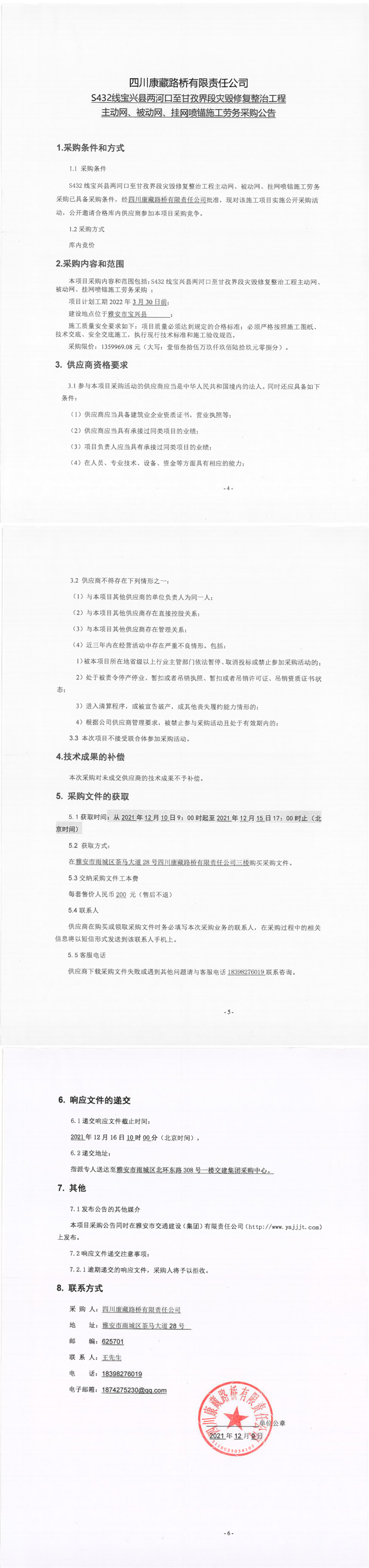 四川康藏路橋有限責(zé)任公司S432線寶興縣兩河口至甘孜界段災(zāi)毀修復(fù)整治工程主動(dòng)網(wǎng)、被動(dòng)網(wǎng)、掛網(wǎng)噴錨施工勞務(wù)采購公告