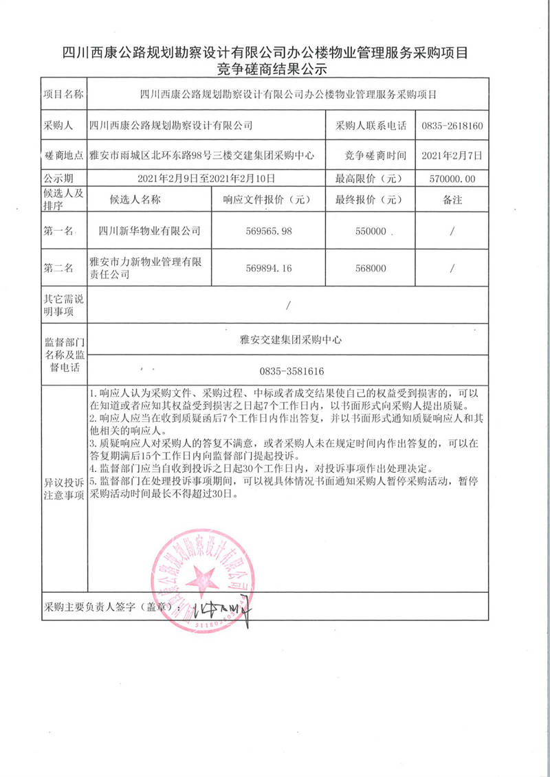 四川西康公路規(guī)劃勘察設(shè)計(jì)有限公司辦公樓物業(yè)管理服務(wù)采購項(xiàng)目競爭磋商結(jié)果公示