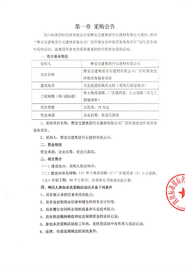 雅安交建集團(tuán)丹石建材有限公司廠區(qū)附屬安全環(huán)保勞務(wù)服務(wù)項(xiàng)目競(jìng)爭(zhēng)談判公告