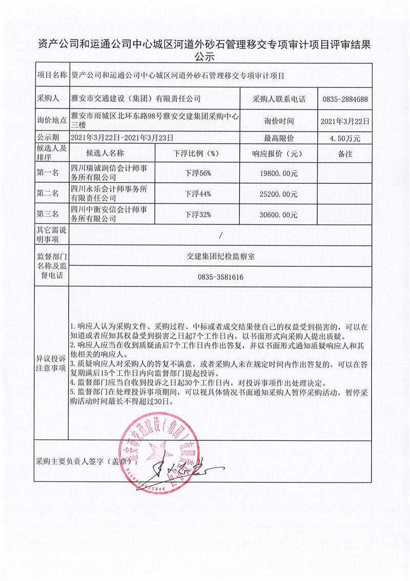雅安市交通建設(集團)有限責任公司資產(chǎn)公司和運通公司中心城區(qū)河道外砂石管理移交專項審計項目評審結(jié)果公示