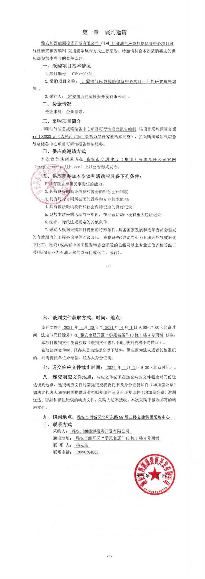 雅安川西能源投資開發(fā)有限公司川藏油氣應(yīng)急戰(zhàn)略儲(chǔ)備中心項(xiàng)目可行性研究報(bào)告編制競(jìng)爭(zhēng)談判公告