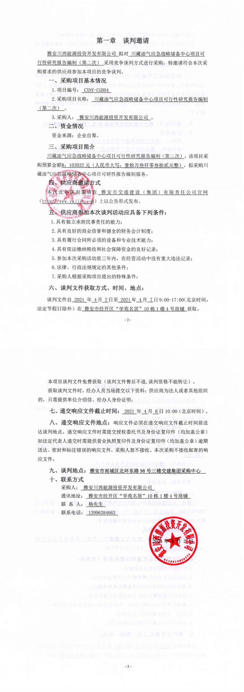 雅安川西能源投資開發(fā)有限公司川藏油氣應(yīng)急戰(zhàn)略儲(chǔ)備中心項(xiàng)目可行性研究報(bào)告編制(第二次)競(jìng)爭(zhēng)談判公告