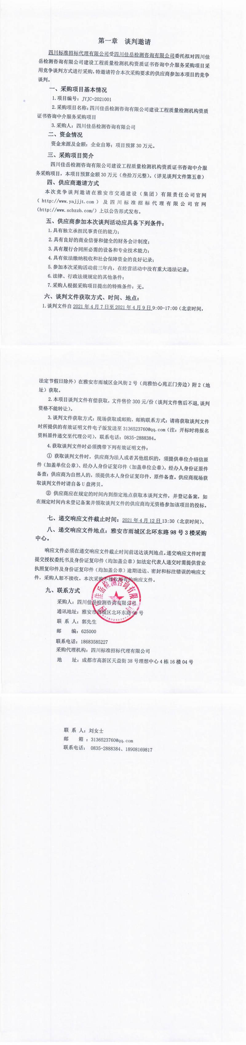 四川佳岳檢測(cè)咨詢有限公司建設(shè)工程質(zhì)量檢測(cè)機(jī)構(gòu)資質(zhì)證書咨詢中介服務(wù)采購項(xiàng)目競(jìng)爭(zhēng)談判公告