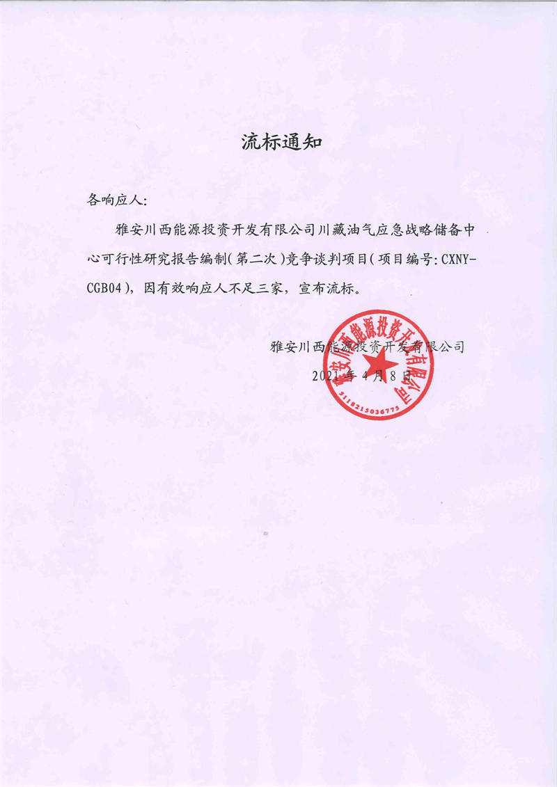 雅安川西能源投資開發(fā)有限公司川藏油氣應(yīng)急戰(zhàn)略儲(chǔ)備中心可行性研究報(bào)告編制(第二次)競(jìng)爭談判項(xiàng)目流標(biāo)通知