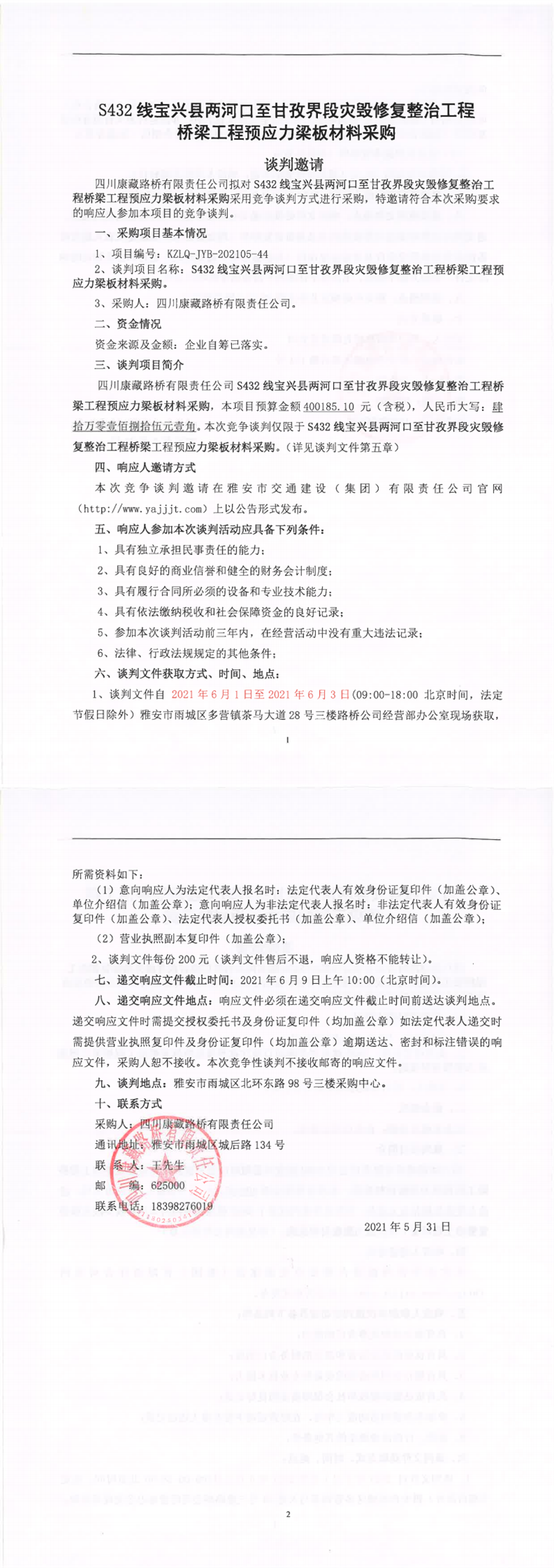 四川康藏路橋有限責(zé)任公司S432線寶興縣兩河口至甘孜界段災(zāi)毀修復(fù)整治工程橋梁工程預(yù)應(yīng)力梁板材料采購競爭談判公告