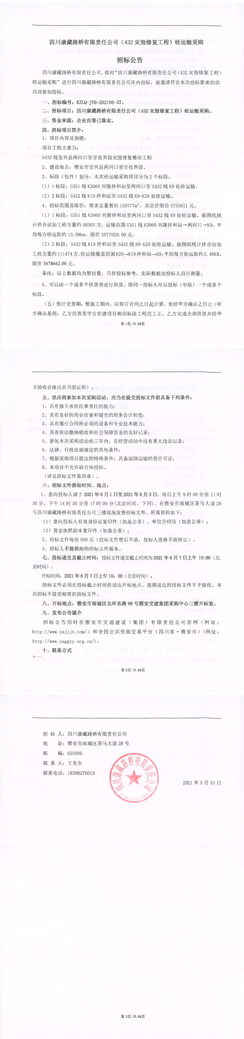 四川康藏路橋有限責(zé)任公司(432災(zāi)毀修復(fù)工程)砼運(yùn)輸采購招標(biāo)公告