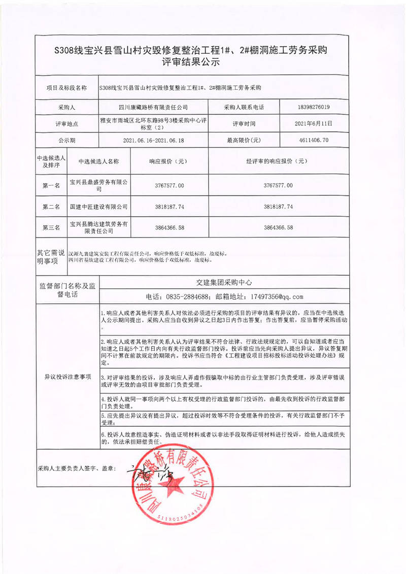 四川康藏路橋有限責(zé)任公司S308線寶興縣雪山村災(zāi)毀修復(fù)整治工程1#、2#棚洞施工勞務(wù)采購評(píng)審結(jié)果公示