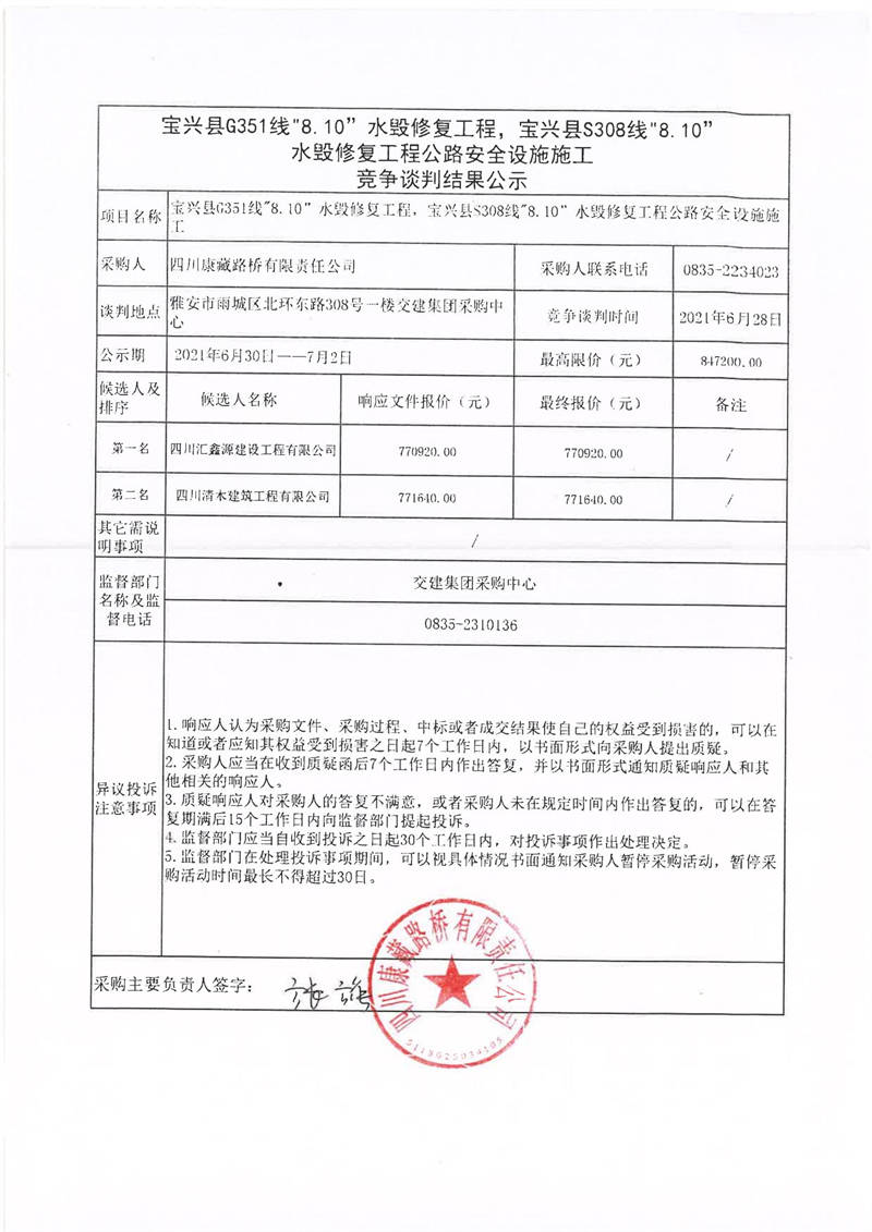 四川康藏路橋有限責(zé)任公司寶興縣G351線“8.10”水毀修復(fù)工程,寶興縣S308線水毀修復(fù)工程公路安全設(shè)施施工競爭談判結(jié)果公示
