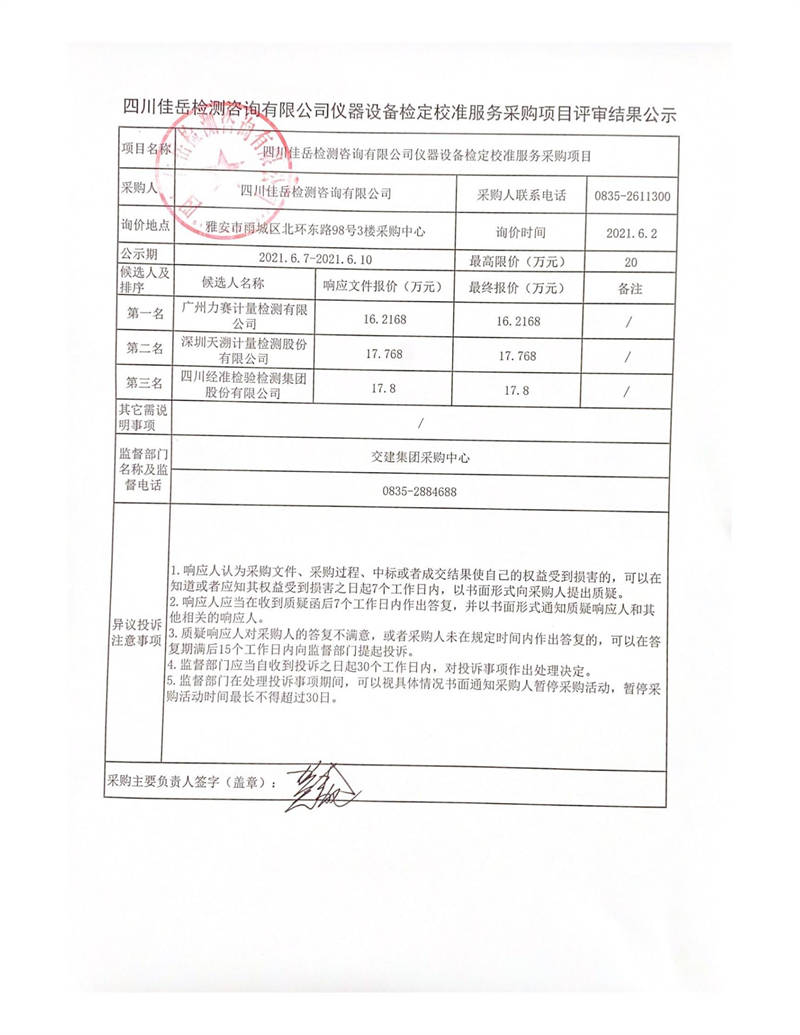 四川佳岳檢測(cè)咨詢有限公司儀器設(shè)備檢定校準(zhǔn)服務(wù)采購項(xiàng)目評(píng)審結(jié)果公示