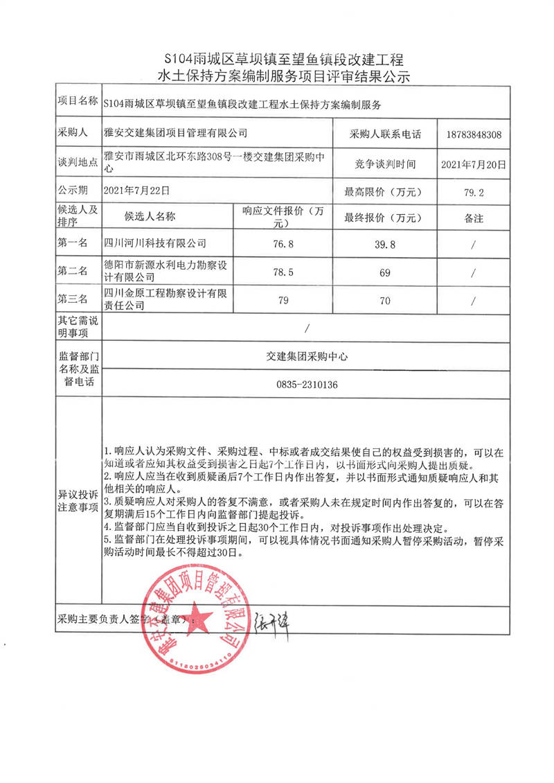 雅安交建集團(tuán)項(xiàng)目管理有限公司S104雨城區(qū)草壩鎮(zhèn)至望魚(yú)鎮(zhèn)段改建工程水土保持方案編制服務(wù)項(xiàng)目評(píng)審結(jié)果公示