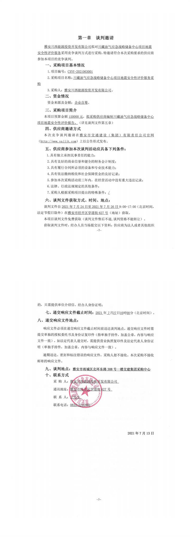 雅安川西能源投資開(kāi)發(fā)有限公司川藏油氣應(yīng)急戰(zhàn)略儲(chǔ)備中心項(xiàng)目地震安全性評(píng)價(jià)服務(wù)采購(gòu)競(jìng)爭(zhēng)談判公告