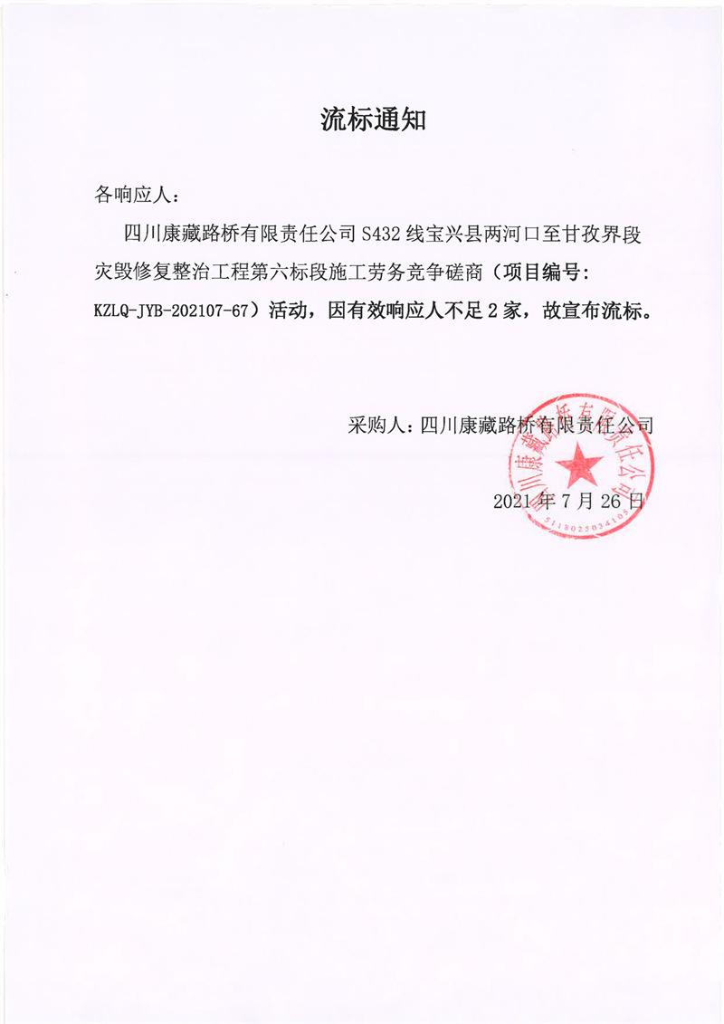 四川康藏路橋有限責(zé)任公司S432線寶興縣兩河口至甘孜界段災(zāi)毀修復(fù)整治工程第六標(biāo)段施工勞務(wù)競(jìng)爭(zhēng)磋商流標(biāo)通知