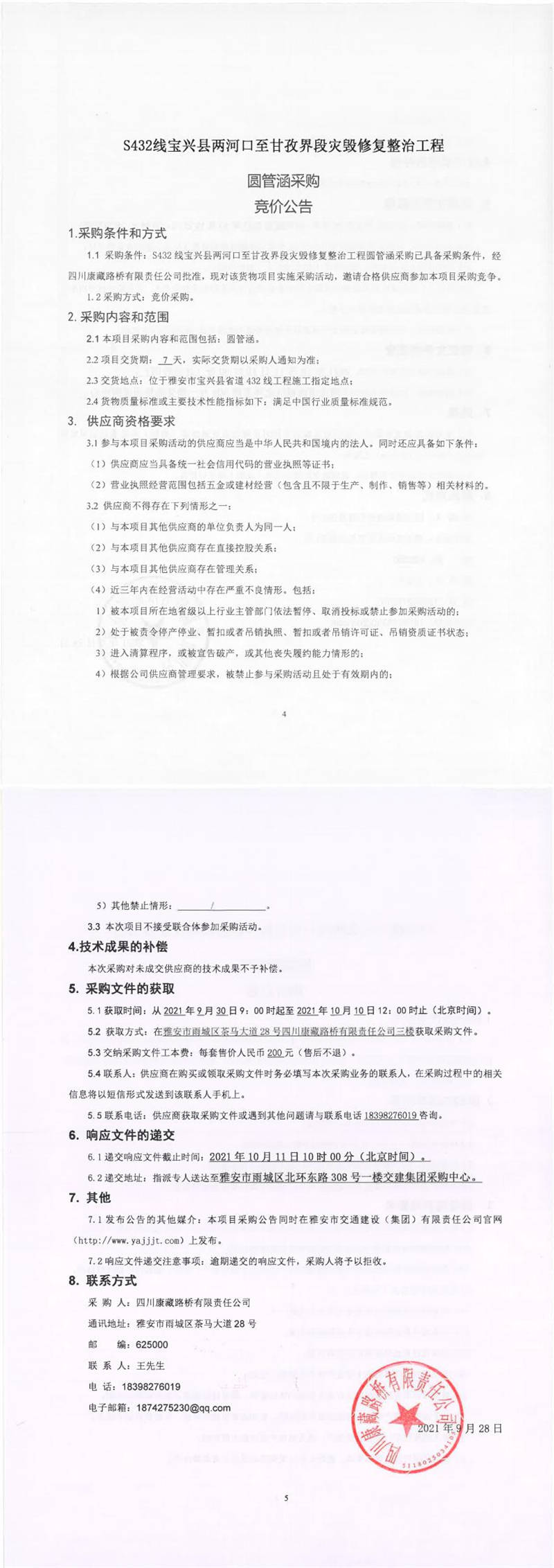 四川康藏路橋有限責(zé)任公司S432線寶興縣兩河口至甘孜界段災(zāi)毀修復(fù)整治工程圓管涵采購競(jìng)價(jià)公告