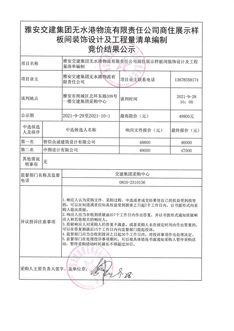 雅安交建集團(tuán)無水港物流有限責(zé)任公司商住展示樣板間裝飾設(shè)計及工程量清單編制競價結(jié)果公示