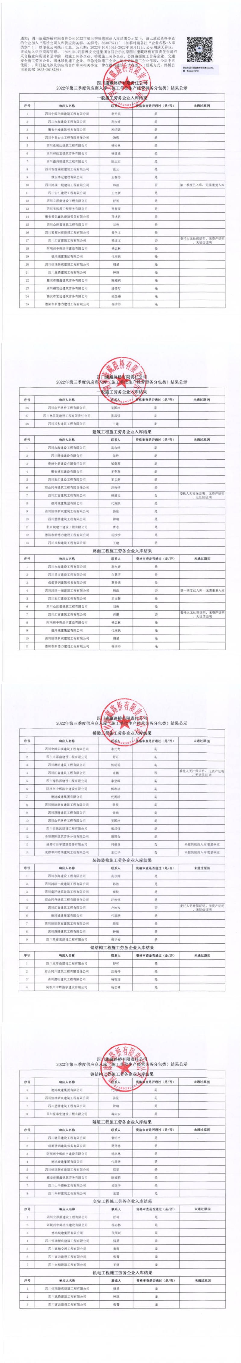 四川康藏路橋有限責(zé)任公司2022年第三季度供應(yīng)商入庫(kù)(施工單位生產(chǎn)經(jīng)營(yíng)勞務(wù)分包類(lèi))結(jié)果公示