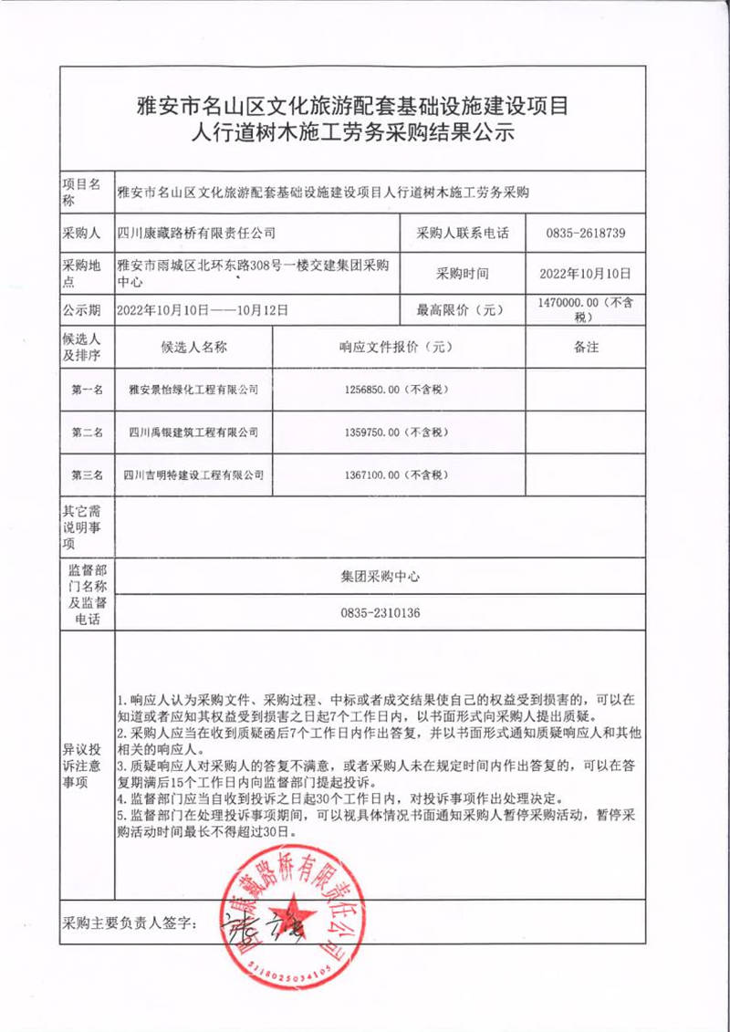 四川康藏路橋有限責任公司雅安市名山區(qū)文化旅游配套基礎(chǔ)設施建設項目人行道樹木施工勞務采購結(jié)果公示