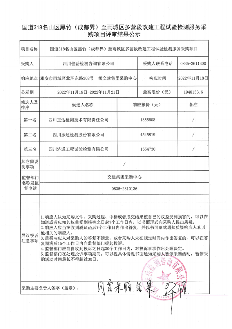 四川佳岳檢測咨詢有限公司國道318名山區(qū)黑竹(成都界)至雨城區(qū)多營段改建工程試驗檢測服務采購項目評審結果公示