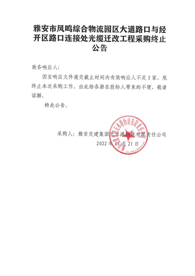 雅安交建集團(tuán)無(wú)水港物流有限責(zé)任公司雅安市鳳鳴綜合物流園區(qū)大道路口與經(jīng)開(kāi)區(qū)路口連接處光纜遷改工程采購(gòu)終止公告