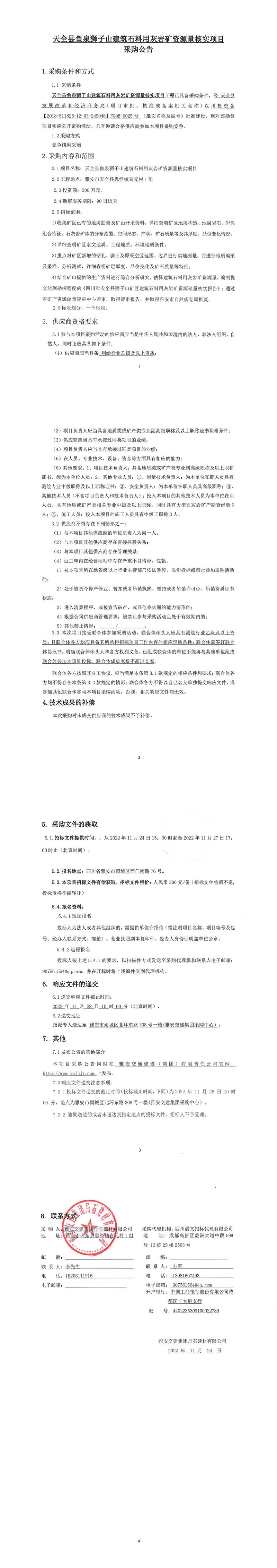雅安交建集團丹石建材有限公司天全縣魚泉獅子山建筑石料用灰?guī)r礦資源量核實項目采購公告