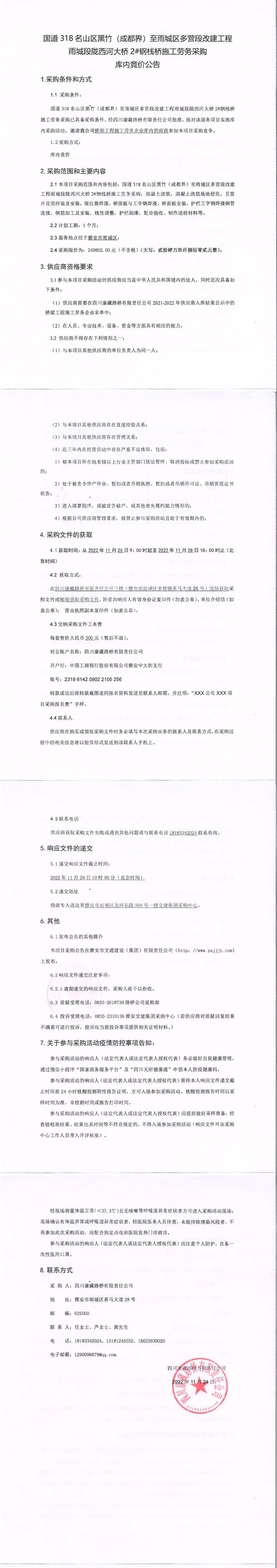 四川康藏路橋有限責(zé)任公司國道318名山區(qū)黑竹(成都界)至雨城區(qū)多營段改建工程雨城段隴西河大橋2#鋼棧橋施工勞務(wù)采購庫內(nèi)競(jìng)價(jià)公告