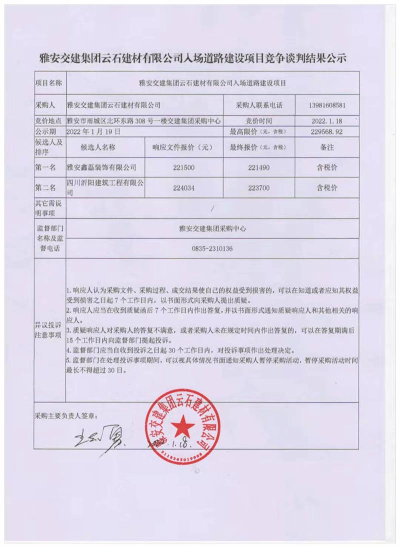 雅安交建集團云石建材有限公司入場道路建設項目競爭談判結(jié)果公示