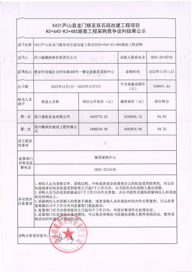 四川康藏路橋有限責(zé)任公司S431蘆山縣龍門鎮(zhèn)至雙石段改建工程項(xiàng)目K0+640-K3+485路面工程采購競(jìng)爭(zhēng)談判結(jié)果公示