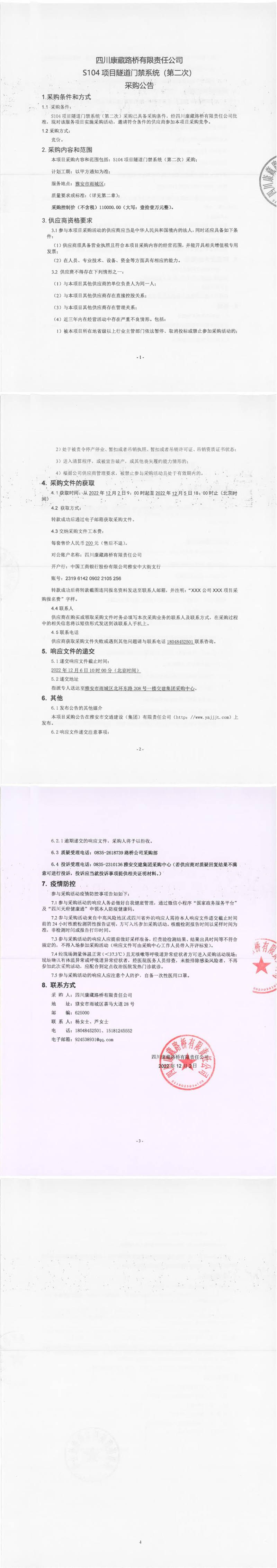 四川康藏路橋有限責(zé)任公司S104項(xiàng)目隧道門禁系統(tǒng)(第二次)采購(gòu)公告
