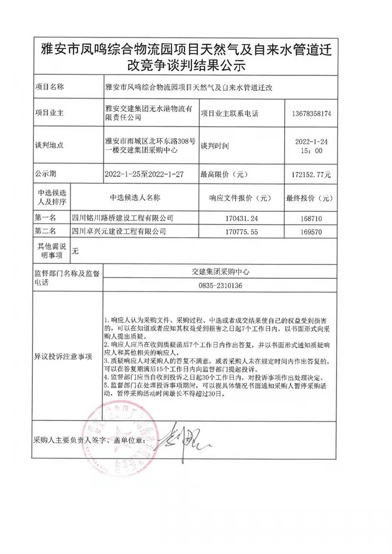 雅安交建集團無水港物流有限責(zé)任公司雅發(fā)市鳳鳴綜合物流園項目天然氣及自來水管道遷改競爭談判結(jié)果公示