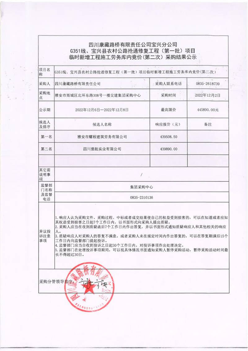 四川康藏路橋有限責任公司寶興分公司G351線、寶興縣農村公路搶通修復工程(第一批)項目臨時新增工程施工勞務庫內競價(第二次)采購結果公示