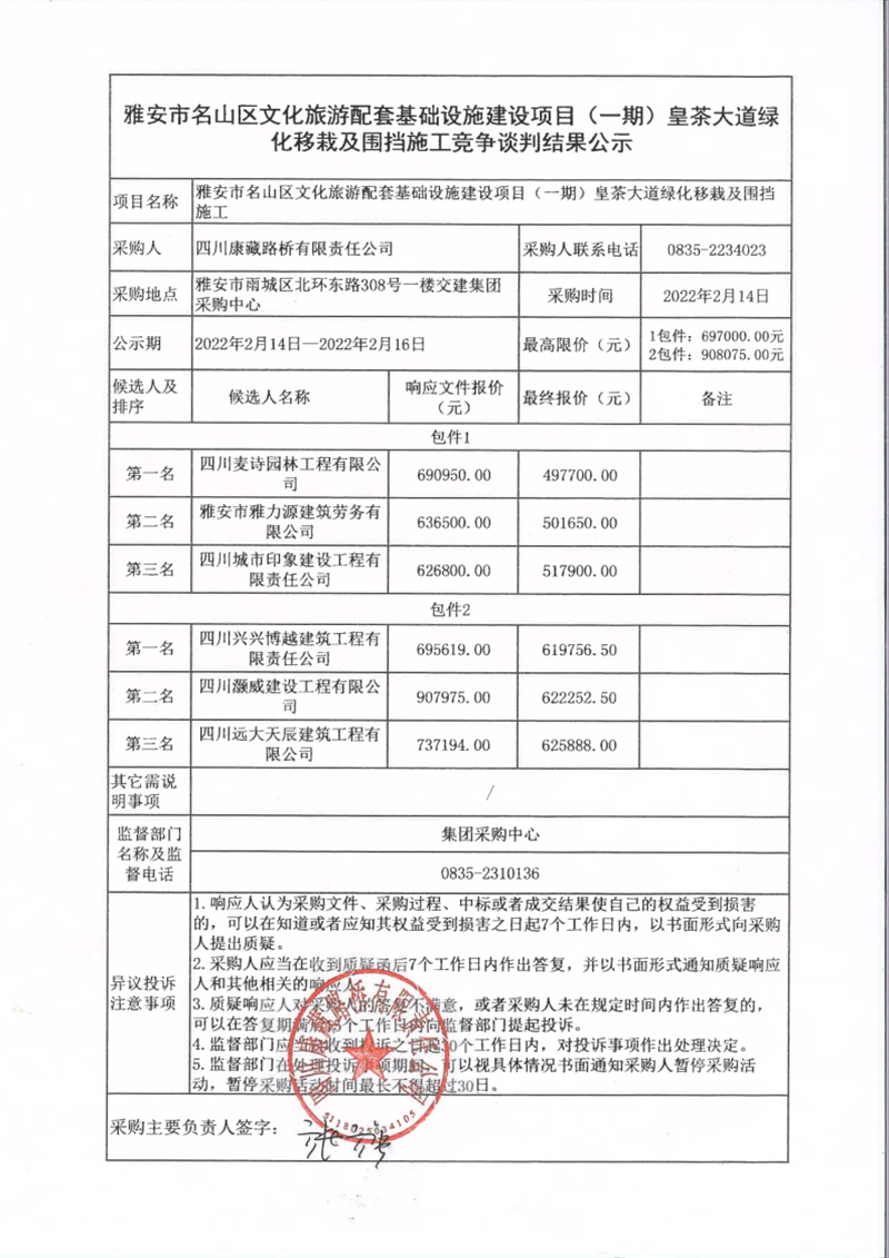 四川康藏路橋有限責(zé)任公司雅安市名山區(qū)文化旅游配套基礎(chǔ)設(shè)施建設(shè)項目(一期)皇茶大道綠化移栽及圍擋施工競爭談判結(jié)果公示