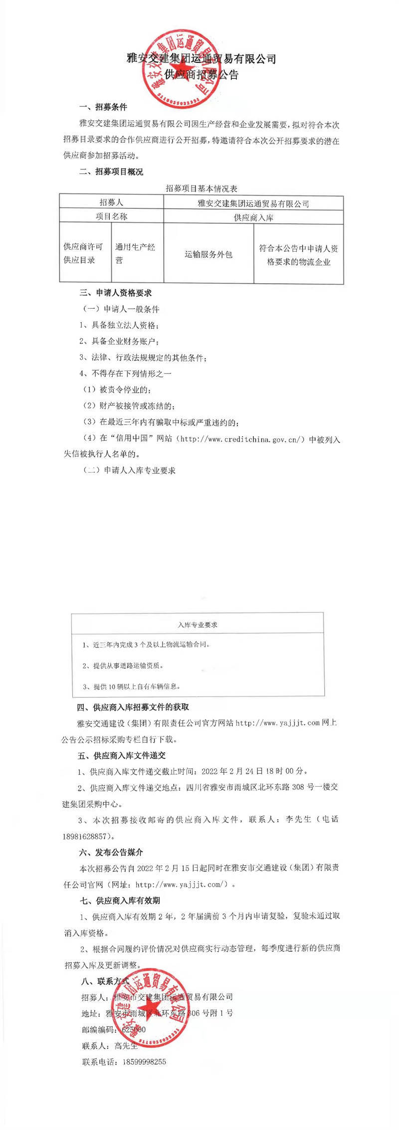 雅安交建集團運通貿(mào)易有限公2022年運輸服務(wù)供應(yīng)商入庫招募文件