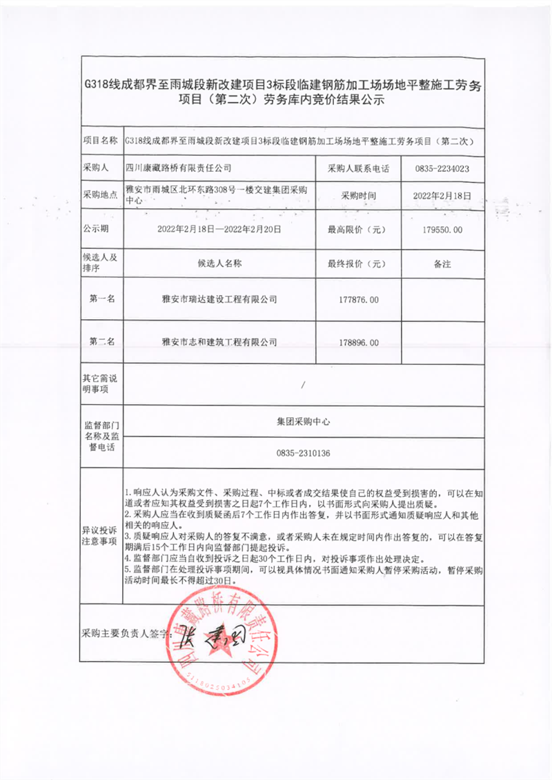 四川康藏路橋有限責(zé)任公司G318線成都界至雨城段新改建項(xiàng)目3標(biāo)段臨建鋼筋加工場(chǎng)場(chǎng)地平整施工勞務(wù)(第二次)庫(kù)內(nèi)競(jìng)價(jià)結(jié)果公示