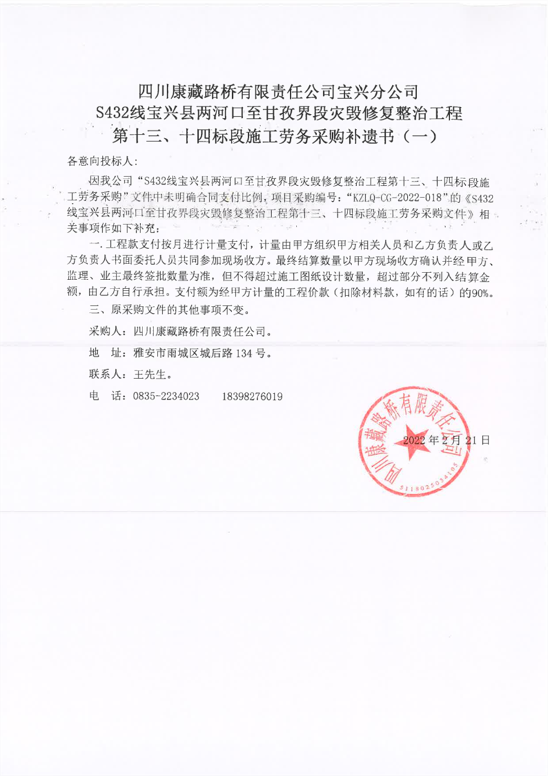 四川康藏路橋有限責任公司寶興分公司S432線寶興縣兩河口至甘孜界段災(zāi)毀修復(fù)整治工程第十三、十四標段施工勞務(wù)采購補遺書(一)