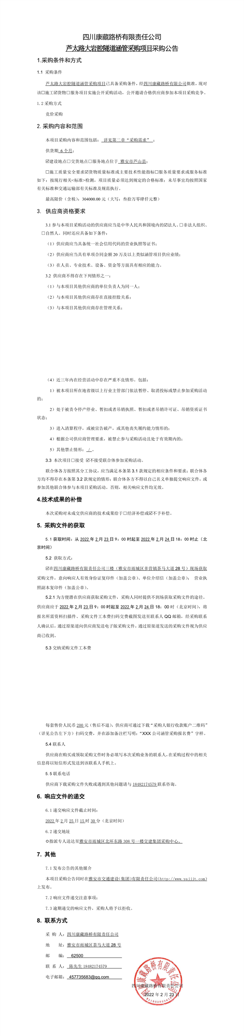 四川康藏路橋有限責(zé)任公司蘆太路大巖腔隧道涵管采購項(xiàng)目采購公告