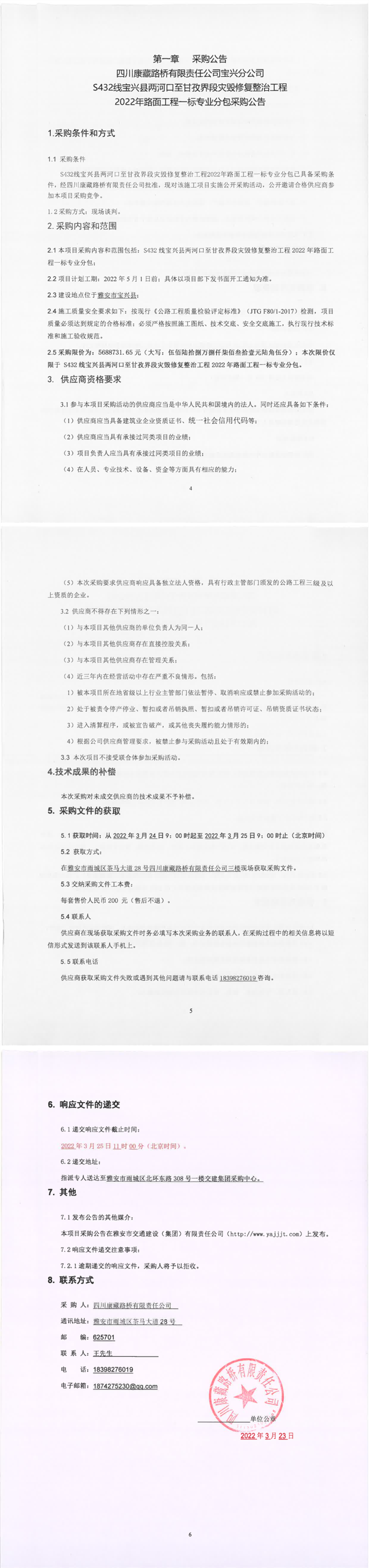 四川康藏路橋有限責(zé)任公司S432線寶興縣兩河口至甘孜界段災(zāi)毀修復(fù)整治工程2022年路面工程一標(biāo)專(zhuān)業(yè)分包采購(gòu)公告