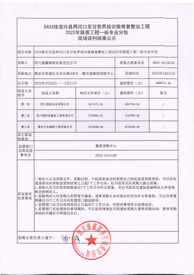 四川康藏路橋有限責任公司S432線寶興縣兩河口至甘孜界段災毀修復整治工程2022年路面工程一標專業(yè)分包現(xiàn)場談判結果公示