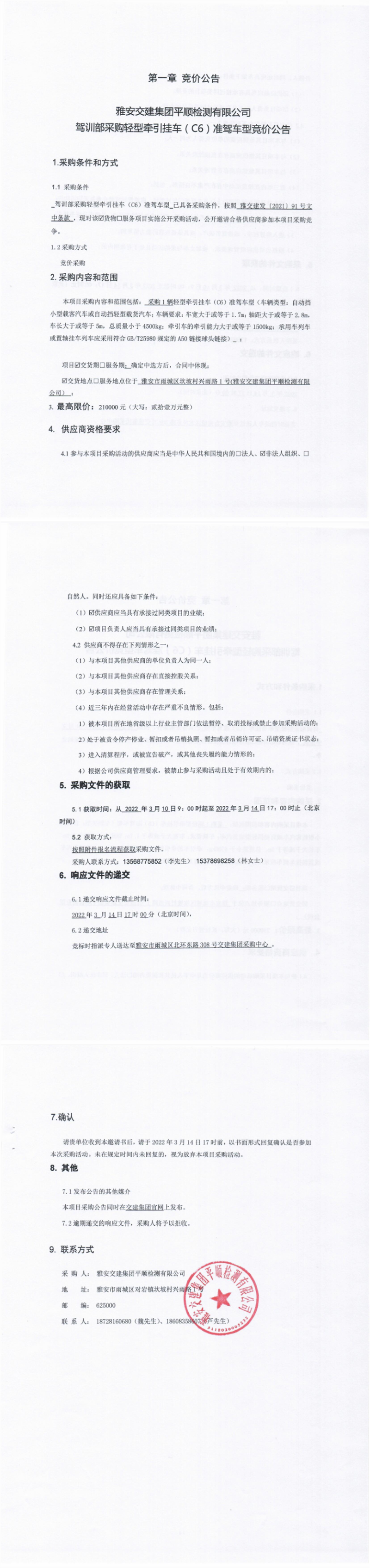 雅安交建集團(tuán)平順檢測(cè)有限公司駕訓(xùn)部采購(gòu)輕型牽引掛車(C6)準(zhǔn)駕車型競(jìng)價(jià)公告