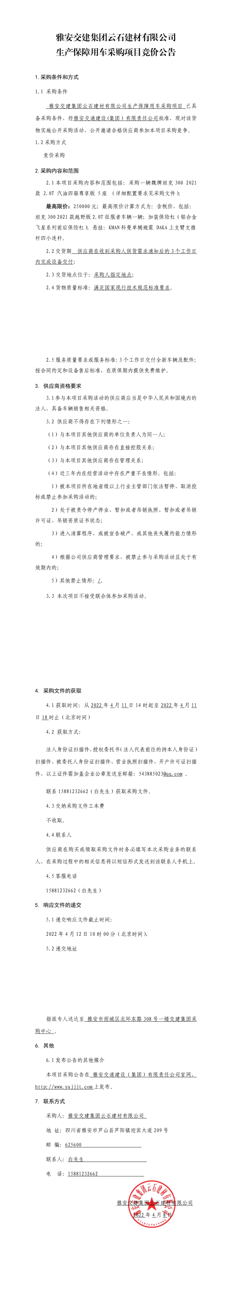 雅安交建集團(tuán)云石建材有限公司生產(chǎn)保障用車采購項目競價公告
