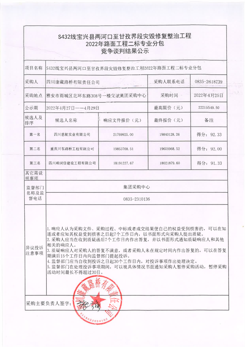 四川康藏路橋有限責任公司S432線寶興縣兩河口至甘孜界段災毀修復整治工程2022年路面工程二標專業(yè)分包競爭談判結(jié)果公示