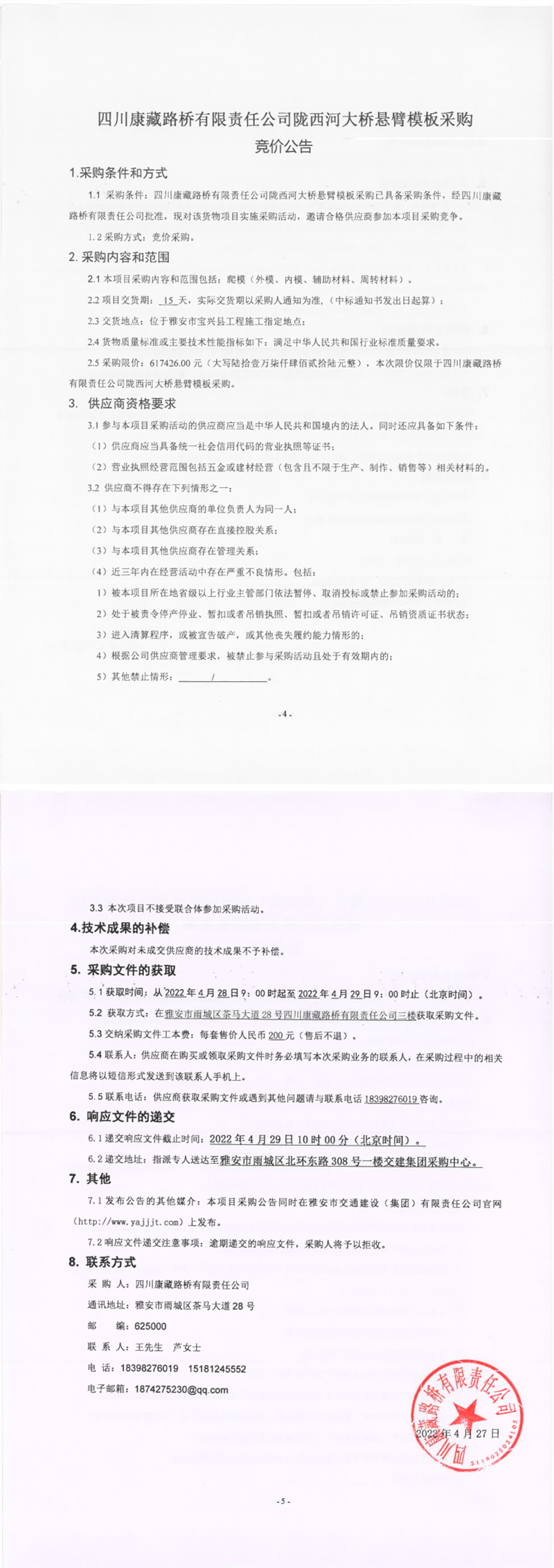 四川康藏路橋有限責任公司隴西河大橋懸臂模板采購競價公告