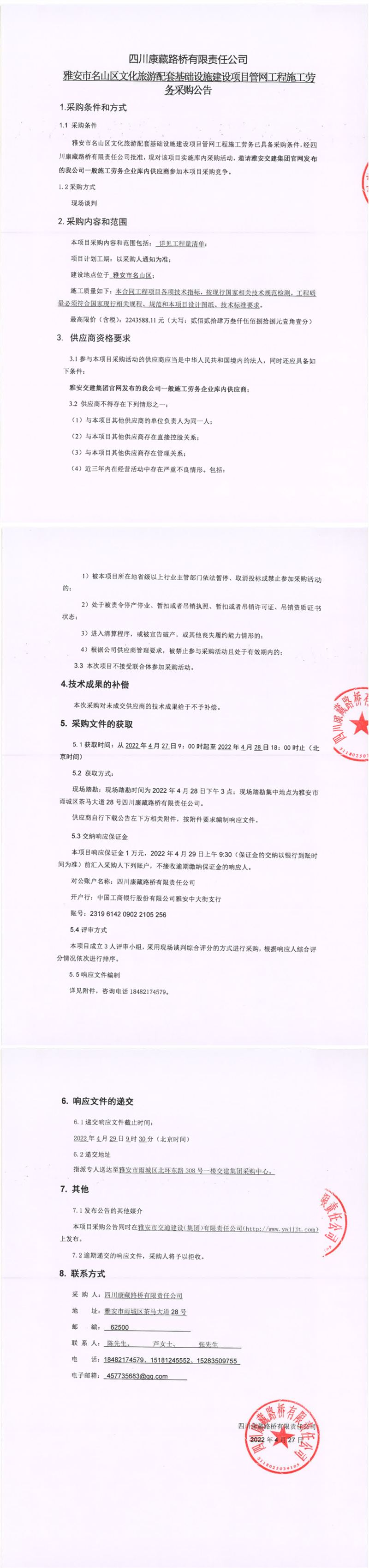 四川康藏路橋有限責任公司雅安市名山區(qū)文化旅游配套基礎(chǔ)設(shè)施建設(shè)項目管網(wǎng)工程施工勞務(wù)采購公告