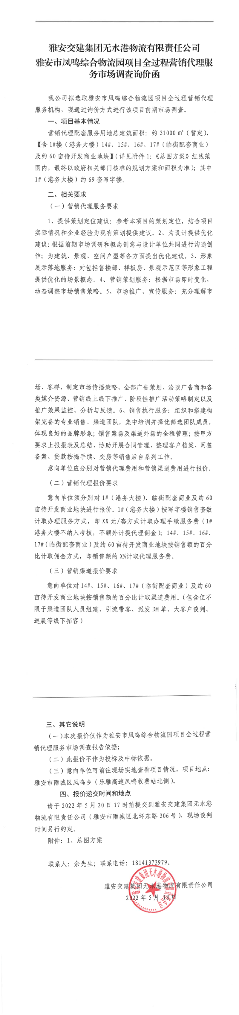 雅安交建集團(tuán)無水港物流有限責(zé)任公司雅安市鳳鳴綜合物流園項(xiàng)目全過程營銷代理服務(wù)市場調(diào)查詢價函