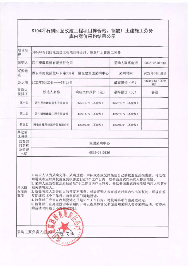 四川康藏路橋有限責(zé)任公司S104坪石到回龍改建工程項(xiàng)目拌合站、鋼筋廠土建施工勞務(wù)庫內(nèi)競(jìng)價(jià)采購結(jié)果公示